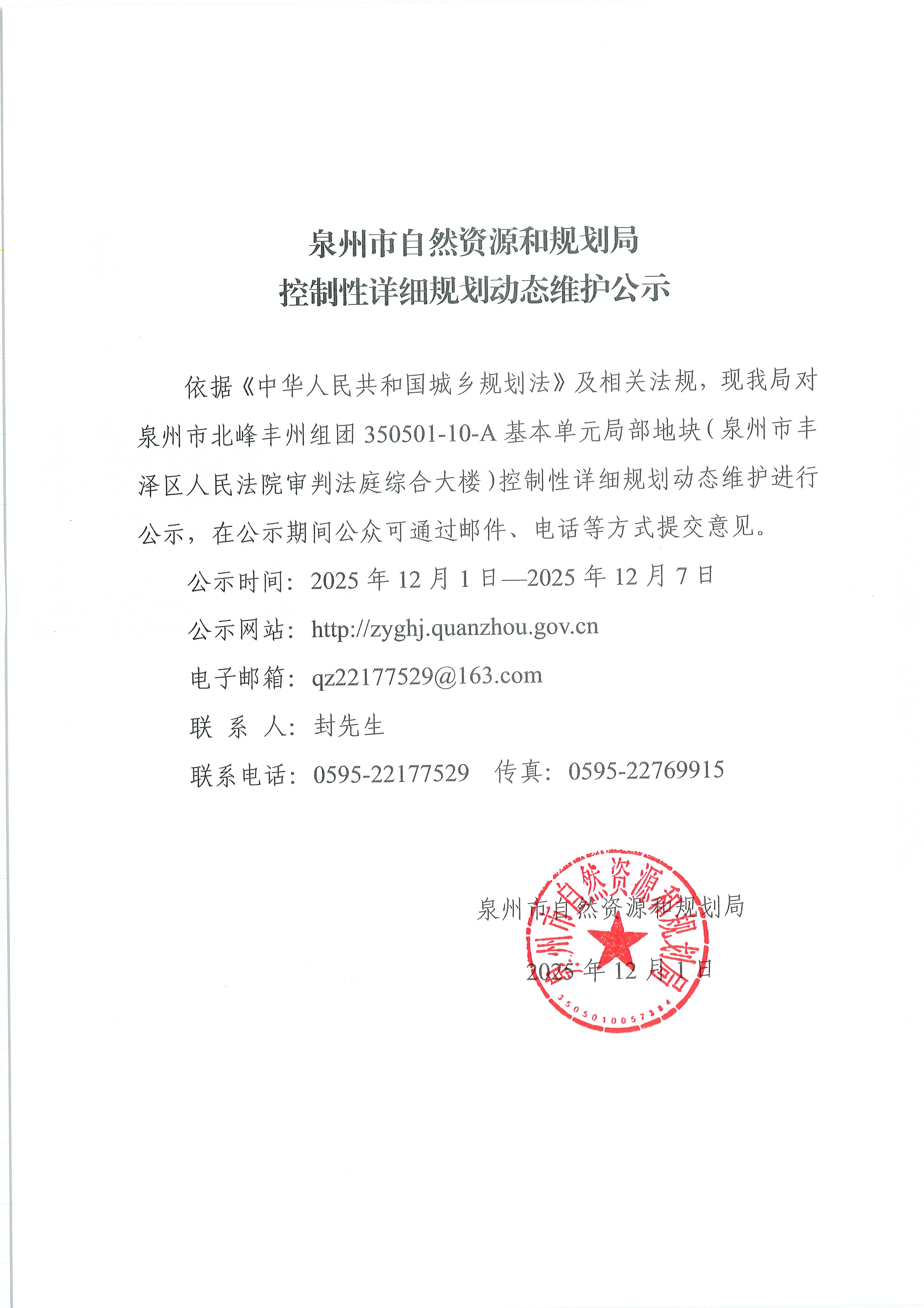 泉州市北峰丰州组团350501-10-A基本单元局部地块(泉州市丰泽区人民法院审判法庭综合大楼)控制性详细规划动态维护